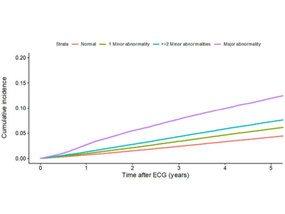 日本における最大の保険者である協会けんぽのデータを用いて、2016年に心電図検査を受検した35歳以上65歳以下のCVDの既往のない加入者(被保険者)369万8,429人を解析した。2016年から2021年における最大5年間の追跡の結果、心房期外収縮などの軽度異常や心房細動などの重度異常が見られた加入者は、正常心電図であった加入者と比較して、CVDが発症するリスクが高いことが明らかになった。さらに、軽度心電図異常の種類だけではなく数が多い場合、CVD発症リスクや重度心電図異常発症リスクがより高くなることが示された。これらの関連は性別や年齢、生活習慣病などの属性による違いは認められなかった。