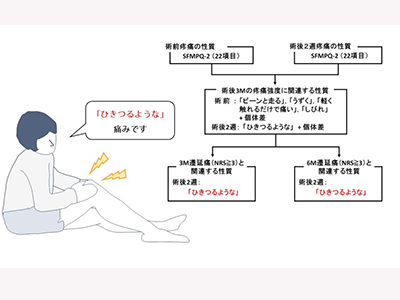いくつかの疼痛の性質(術前:「ビーンと走る」「うずく」「軽く触れるだけで痛い」「しびれ」、術後2週:「ひきつるような」)は、術後3か月の疼痛強度と関連していた。さらに、術後2週の「ひきつるような」といった疼痛の性質のみが術後3か月、6か月における遷延痛(NRS≧3)の存在と関連していた。