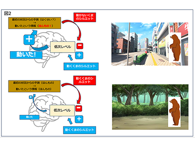 クマのシルエットを見たときの認識を例に挙げると、都会の街角で見た場合、多くの人の初期の予測は剥製などの動かないクマかもしれないが、山奥で見たときの初期の予測は本物の動くクマと考えられる。このように、最初の予測は環境や過去の経験に基づいて異なる。つまり、それぞれの予測信号が異なる。都会ではクマのシルエットが動かないという予測信号が強くなり、山奥ではクマが動く可能性が高いという予測信号が強くなる。しかし、実際の感覚入力としてクマのシルエットが動くことがある。このとき、都会でクマが動いた場合は「動いた!」という大きな予測エラーシグナルが生じる。これは初期の予測と感覚入力が大きく異なるためだ。一方、山奥でクマが動いた場合、「やっぱり動いた」という小さな予測エラーシグナルが生じる。こちらは初期の予測と感覚入力が一致するためだ。これらの予測と予測エラーがスムーズに情報交換を行い、脳は必要に応じて予測を素早く適切に変更していく。都会ではクマが動くという新しい情報に驚き、「本物だ!」という新しい予測が形成され、山奥では予測が確認され、「やっぱり本物だ」という認識が強化される。このように、予測符号化はトップダウンの予測とボトムアップの感覚入力との間の動的な相互作用を通じて、ヒトの知覚体験を連続的に洗練させる。