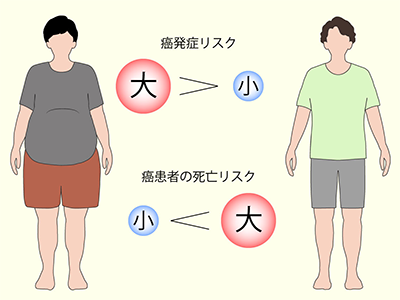 肥満は、糖尿病などの生活習慣病および非小細胞がんなどのがんの発症リスク上昇(腫瘍増大)と関連することが報告されている。一方で、抗がん剤による化学療法を受けたがん患者の生存率は、正常体重のがん患者と比べて高いことが報告されている。この矛盾は、「肥満パラドックス」として知られており、従来の抗がん剤を受けているがん患者だけでなく、免疫療法を受けているがん患者にも存在する。また、基礎研究等において、肥満によって免疫細胞が疲弊し、免疫療法の効果が不十分となる可能性が示唆されている。