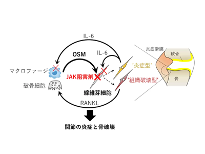 ヒト関節リウマチ患者の炎症滑膜のシングルセル解析においても、マクロファージにおけるOSM発現と線維芽細胞のOSM受容体の発現が高いことが認められた。JAK阻害剤によってどの細胞の、どのシグナル経路が抑制されるか検討したところ、線維芽細胞のOSMシグナル経路が最も強く抑制され、続いてマクロファージのIL-6シグナル経路の抑制も認められた。試験管内で、線維芽細胞の培養系にOSMを添加すると、IL-6などの炎症誘導に関わる遺伝子群や破骨細胞誘導因子RANKLなどの骨破壊を促進する遺伝子群の発現が顕著に上昇し、JAK阻害剤の添加により抑制されることがわかった。このことからOSMは線維芽細胞に作用して炎症や組織破壊をひきおこす能力を高め、これらの活性はJAK阻害剤によって抑制されることがわかった。