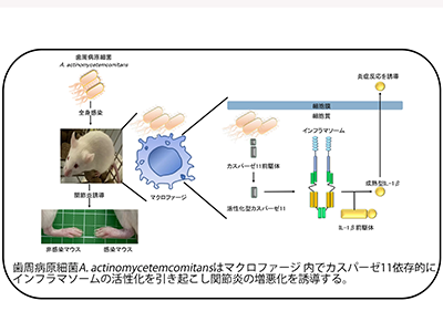 研究グループは、A. actinomycetemcomitansをマウスへと全身感染させ、さらに関節炎を誘導させた。その結果、肢の腫れ、滑膜内の細胞浸潤および肢内の炎症性サイトカインIL-1β濃度が、非感染群や他の歯周病細菌感染群に比べると有意に上昇することを見出した。さらに、マクロファージ除去試薬Clodronate投与により、関節炎増悪化の兆候は抑制された。以上の結果から、A. actinomycetemcomitans感染による関節炎増悪化には、マクロファージの作用が重要であると考えた。実際にマウス骨髄由来マクロファージにA. actinomycetemcomitansを感染させたところ、A. actinomycetemcomitansはマクロファージに対してインフラマソームの活性化に伴うIL-1βの産生を引き起こすことが明らかになった。
