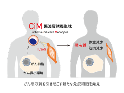 悪液質を発症したマウスで、筋萎縮に関連のIL36Gを産生する単球を発見