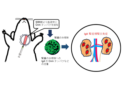 研究グループはこれまでに、IgA腎症を患っている患者の唾液より分離したむし歯菌(ミュータンスレンサ球菌)をラットの頸静脈より投与することで、IgA腎症様の腎炎を発症させることに成功していた。そして、患者から分離された菌の表層には、通常のむし歯菌ではあまり存在していないコラーゲンに結合するCnmタンパク質というものが存在していることを突き止め、このCnmタンパク質自体がIgA腎症発症メカニズムの一端に関与しているのではないかという仮説に至った。