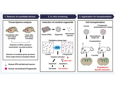 今回研究グループは、成長因子として知られるN結合型糖タンパク質のプログラニュリン(PGRN)でヒトiPS細胞由来脳オルガノイドを前処理すると、マウスの脳に移植した際に細胞の生着と神経突起伸長の両方を改善することを明らかにした。