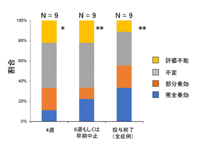 治療の効果は、疾患活動性(発熱、肝障害、ぶどう膜炎、血管炎、皮膚病変)がすべて消失した場合を「完全奏効」、一部の症状が消失し、さらに新しい症状が現れなかった場合を「部分奏効」、新たな症状が出現した場合を「進行」として評価した。ルキソリチニブを服用後、8週間後、または早期終了した患者で効果を評価した(主評価項目)。主評価項目における完全奏効率は22%(9人中2人)だった。4週目時点での完全奏効率は11%(9人中1人)だった。延長投与を行った患者も含めると、治療終了時の完全奏効率は30%(9人中3人)となった。