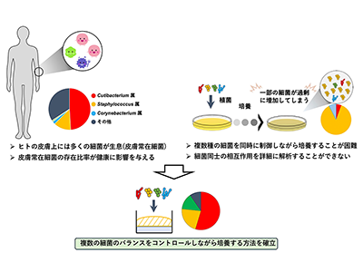 ヒトはさまざまな細菌と共生しており、皮膚にも多様な常在細菌叢が存在する。皮膚常在細菌叢のバランスは人間の健康にとって重要であり、細菌叢の乱れはアトピー性皮膚炎、ニキビ、乾癬などの皮膚疾患と関連していることが知られている。そのため、近年、皮膚常在細菌叢は、皮膚疾患の治療対象として注目されている。皮膚常在細菌叢を理解することは健康と病気の管理において非常に重要だ。しかし、これらのバランスを維持したまま各細菌叢を培養するのは非常に難しいことが課題であり、皮膚に似せた環境を人工的に再現するのは困難だった。