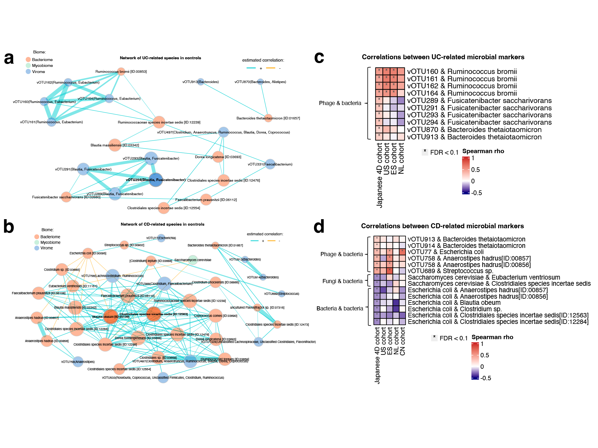 最後に、細菌、ファージ、真菌間の相互作用を調査するため、細菌、ウイルス、真菌種の相関ネットワークを構築した。その結果、UC、CDともに、短鎖脂肪酸産生菌がクラスターを形成していることを明らかにした。また、UC患者ではRuminococcus bromiiや Fusicatenibacter saccharivorans、CD患者ではEscherichia coli、Bacteroides thetaiotaomicron、Anaerostipes hadrusなどの細菌が、それらに感染するファージと正の相関することが確認された。一方、CD患者での増加が確認されているEscherichia coliとSaccharomyces cerevisiaeは、Eubacterium ventriosum、Anaerostipes hadrus、Blautia obeumなどの短鎖脂肪酸産生菌と負の相関を示した。そして、同発見は米国、スペイン、オランダ、中国のコホートでも同様に確認された。