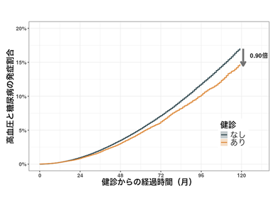 延べ29万3,174人を最長10年(中央値4.2年)にわたり追跡し糖尿病と高血圧の発症の有無を評価したところ、健診ありの人で10.6%、健診なしで11.4%と、健診を受けた人の方が、リスクが低い傾向にあることがわかった。さらに背景因子の統計的な調整を行ったところ、健診を受けた人はそうでない人に比べて、糖尿病・高血圧の発症が0.90倍と低いことが確認された(率としては1.6%減)。さらに、糖尿病や高血圧を別個に評価した追加の解析などでも同様の傾向が示された。