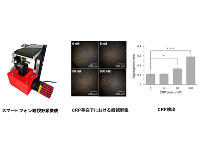 また、医療現場で、簡易な機器などにより迅速に検査を行うPOCT(Point of Care Testing)の実現に向けて、スマートフォンを用いた簡易型暗視野顕微鏡を開発。今回、ステージ位置調整システムを導入することで、CRP存在下で形成される、金ナノ粒子集合体の単一クラスター解析が可能になり、スマートフォンを用いた暗視野顕微鏡による50nM CRP検出に成功した。