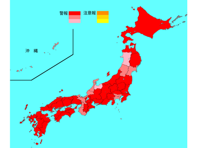 全国の保健所管轄区域のうち、警報レベルを超えている保健所管轄区域は413か所で、47都道府県に分布していた。また、注意報レベルを超えている保健所管轄区域は28か所で、19都道府県に分布していた。