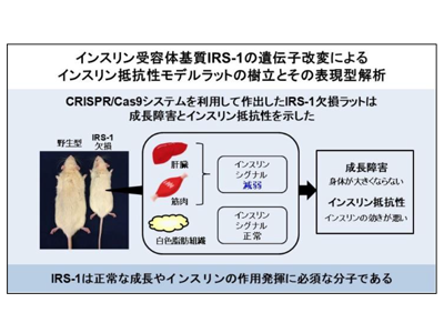 インスリンは糖代謝だけでなく、脂質やタンパク質の代謝の調節にも重要な役割を担っている。インスリンの生理作用は栄養状態によって変動し、その作用不全は糖尿病や動脈硬化などさまざまな疾患を引き起こす。「今回樹立されたモデルラットは、IRS-1の生理機能や成長の仕組みを明らかにするためのツールとしてだけではなく、生活習慣病の発症要因となり得るインスリン抵抗性の予防や治療法の開発に役立つことが期待される」と、研究グループは述べている。