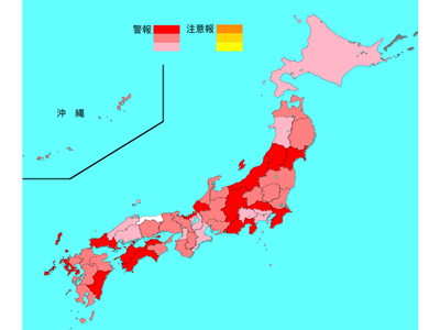 全国の保健所管轄区域のうち、警報レベルを超えている保健所管轄区域は256か所で、46都道府県に分布していた。また、注意報レベルを超えている保健所管轄区域は24か所で、19都道府県に分布していた。