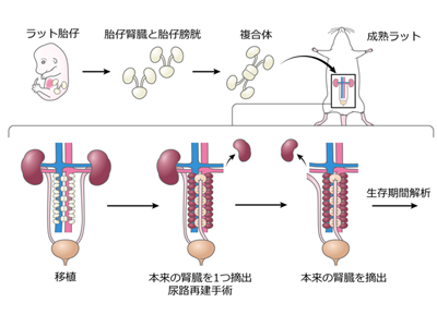 ラット胎仔から摘出の腎臓・膀胱を吻合、複合体を複数個移植し生存できる期間を解析