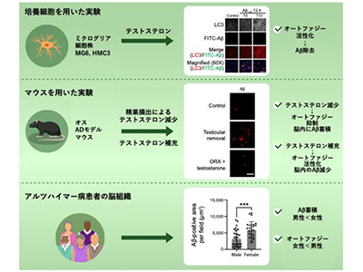 今回の研究では、脳内の免疫細胞であるミクログリアに着目。ADの病態の特徴の一つである、アミロイドβ(Aβ)の蓄積は、神経細胞にとって有害なストレスとなる。正常なミクログリアはAβなどの異常タンパク質を貪食・分解し、脳の恒常性を維持する。しかし、Aβの異常な凝集・蓄積が起こると、ミクログリアが正常に機能できず、不要なタンパク質の除去過程が阻害され、脳内の慢性炎症、ひいては神経細胞死が引き起こされる。この過程に性差があれば、それがAD発症の性差となって表れる可能性がある。ミクログリアのAβ処理機構の1つとして、オートファジーが関与していることが報告されている。オートファジーは、細胞内の不要なタンパク質や細胞成分を分解する機能のことである。今回の研究では、ミクログリアのオートファジー制御におけるテストステロンの役割を解析した。