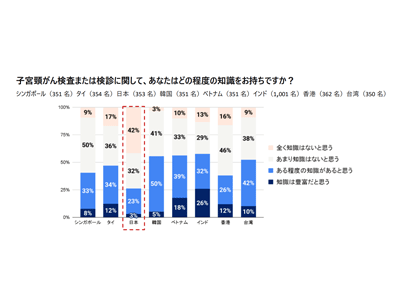 子宮頸がん検査または検診に関する質問では、「知識は豊富だと思う(3%)」「ある程度の知識があると思う(23%)」と日本の女性は全体の3割を下回り、APAC8か国・地域中で最も低い結果に。「あまり知識はないと思う(32%)」「全く知識はないと思う(42%)」が7割以上になった。