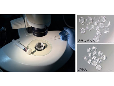 はじめに、培養液に触れるさまざまなガラス器具(ガラスボトムディッシュ、培養液の滅菌フィルター、胚の移動に用いるガラスキャピラリー)を用いてマウス胚発生への影響を検討した。その結果、程度の差はあるものの、いずれの器具、いずれのメーカーのものにも毒性が認められた。
