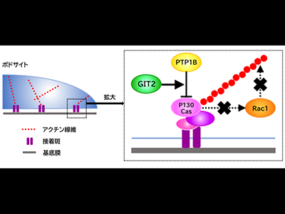 続いて、培養ポドサイトを用いてその分子メカニズムを解明した。まずGIT2はポドサイトの接着斑に局在することがわかった。そしてGIT2発現が低下した細胞ではRac1活性が亢進し、細胞形態の変化や運動能の亢進が見られた。同細胞では、脱リン酸化酵素であるPTP1Bの接着斑への移行が障害され、接着斑にRac1を引き寄せるタンパク質であるp130Casのリン酸化が亢進していた。