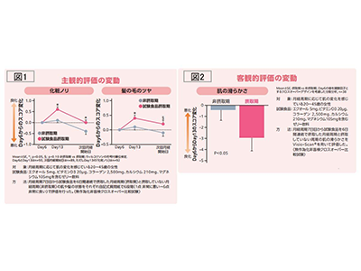 研究の結果、非摂取期の自記式質問紙調査より、Day6からDay13にかけては、「全体的な肌の調子」等の3項目で肌状態のスコアが有意に向上し、Day6から次回月経開始日にかけて12項目で有意なスコアの悪化が認められた。