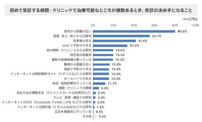 それでは、初めて受診するクリニックを選ぶ際、患者は何を判断材料にしているのだろうか。受診の決め手について複数回答で尋ねたところ、クリニックへの期待や医師へ求めることとは裏腹に、「自宅からの距離が近い」が最も多いという結果に(80.2%)。続いて、「家族・友人・知人からの評判」(55.1%)、「駐車場がある」(41.6%)、「webで予約ができる」(33.4%)と、利便性を重視する患者のホンネが浮き彫りとなった。なお、「インターネットの病院検索サイト(クチコミなど)での評判」を挙げる声も15.6%と、インターネット上での情報も判断材料の一端を担っていた。