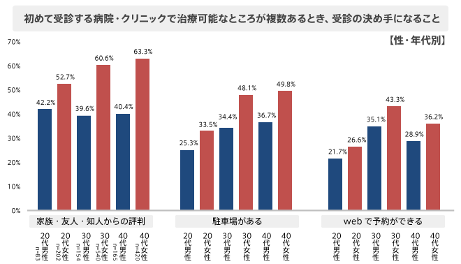 年代・性別ごとの分析では、「家族・友人・知人からの評判」を重視するのは、40代女性(63.3%)、30代女性(60.6%)で多く、20~40代男性が40%前後であるのに比べ高い傾向がみられた。「駐車場がある」についても、40代女性(49.8%)と30代女性(48.1%)が重視している一方、20代男性では25.3%と低い結果であった。さらに30代女性は、「webで予約ができる」も支持(43.3%)。40代女性(36.2%)、30代男性(35.1%)も30%超が支持しているものの、その他の世代・性別では20%台に留まり、評価が分かれた。これらの結果から、利便性を最優先に考える30~40代女性患者の姿が浮かび上がってきた。