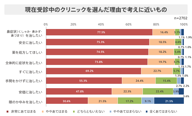 現在通院中のクリニックを選んだ理由を複数回答で尋ねたところ、「非常にあてはまる」の回答が最も多かったのは、「鼻症状を治したい」で77.5%だった。次いで、「安全に治したい」(75.3%)、「薬を処方してほしい」(74.5%)の順となった。「全体的に症状を治したい」(73.8%)も僅差で4位にランクインしており、症状緩和への期待が大きいことが窺える。