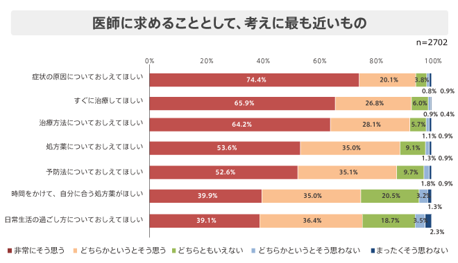次に、医師に求めることについても複数回答で質問したところ、「症状の原因について教えてほしい」で、「非常にあてはまる」の回答が最多(74.4%)。以下、「すぐに治療してほしい」(65.9%)、「治療方法について教えてほしい」(64.2%)と続いた。「予防法について教えてほしい」との声も52.6%あった。