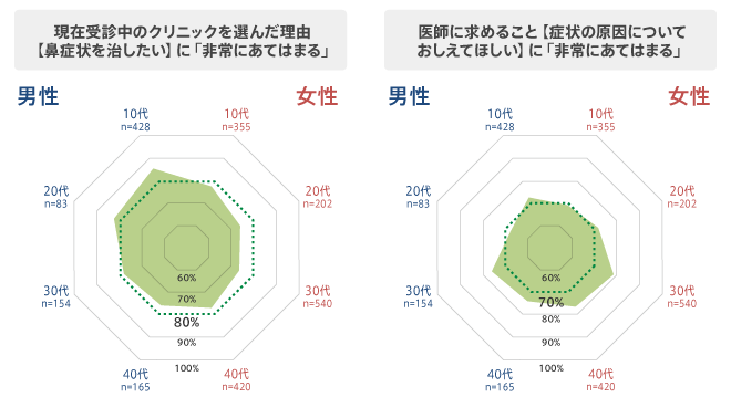 年代・性別ごとに分析すると、クリニックを選んだ理由として、特に10代男性(85.3%)と20代男性(81.9%)が「鼻症状を治したい」を多く挙げていることがわかった。ほかの世代の男性や全世代の女性が70%台であったのに比べると、高い傾向がみてとれる。10~20代は受験や就職など、その後の人生を左右するイベントを控えているうえ、異性の目が気になる年頃でもある。若い彼らにとって鼻症状の悩みがいかに深刻かが、この結果から推し量られるといえよう。