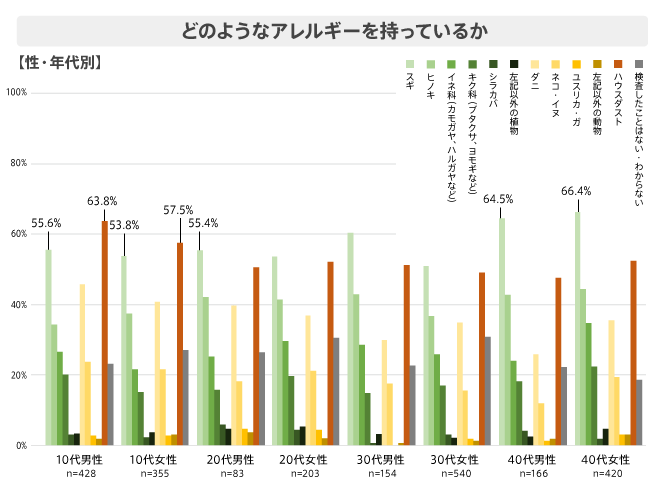 アレルギーの原因物質について複数回答で訊ねたところ、「スギ」が最も多く58.1%。次いで「ハウスダスト」(53.4%)、「ヒノキ」(39.6%)、「ダニ」(36.0%)と続いた。これを性別・年代ごとに分析したところ、20代以上では「スギ」が「ハウスダスト」を上回っていたのに対し、10代では「スギ」(男性:55.6%、女性:53.8%)よりも「ハウスダスト」(男性:63.8%、女性:57.5%)の回答が多かった。また、「スギ」と答えた割合は、10~20代では55%程度であるのに比べ、40代では男性64.5%、女性66.4%と多かった。一方で、「ハウスダスト」については、10代の6割近くが該当すると答えており、ほかの年代よりも高い傾向がみられた。