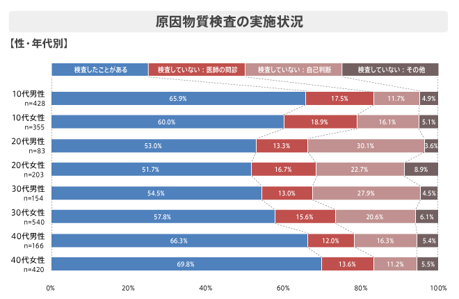 これらのアレルギーの原因物質について、検査をしたことがあると回答したのは61.8%だった。少数派ではあるが、自己判断との回答が17.2%あったことから、検査の実施状況をさらに解析した。性別・年代ごとにみると、40代女性の69.8%、40代男性の66.3%が「検査をしたことがある」と回答。これに対して20代では、男性(53.0%)、女性(51.7%)とも検査実施は5割程度に留まり、半数は検査をしていないことが明らかになった。「自己判断」と回答したのは、20代男性(30.1%)、30代男性(27.9%)、20代女性(22.7%)、30代女性(20.6%)の順に多く、これらの年代では自己判断が4~5人に1人程度の割合でいるという実態が見えてきた。