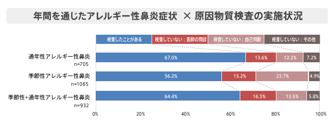 それでは、通年性の患者と季節性の患者では、原因物質に関する検査の実施率に違いがあるのだろうか。1年中同じ症状がある通年性アレルギー性鼻炎患者と、特定の季節だけ症状がある季節性アレルギー性鼻炎患者、1年中症状はあるが季節により変化する通年性と季節性両方のアレルギー性鼻炎患者の3群で検査の実施状況を調べたところ、通年性のアレルギー性鼻炎患者は67.0%がアレルギーの原因物質に関する検査を実施。通年性と季節性両方のアレルギー性鼻炎患者も64.4%と、季節性アレルギー性鼻炎患者の56.2%を上回った。かたや自己判断と答えた割合は、季節性アレルギー性鼻炎患者が23.7%と、通年性(12.2%)、通年性・季節性両方(13.5%)を上回り、季節性アレルギー性鼻炎患者のおよそ1/4が自己判断でアレルギーの原因物質を決めていることが明らかになった。