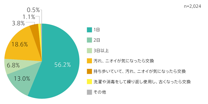 また、マスクは長時間使用すると雑菌が繁殖する。菌の増殖スピードを考慮すると、24時間以内に取り替えることが望ましい。しかし、約2割の人が2日以上使用しているというデータもある6)。外したら新しいマスクに付け替える習慣をつけることが大切だ。