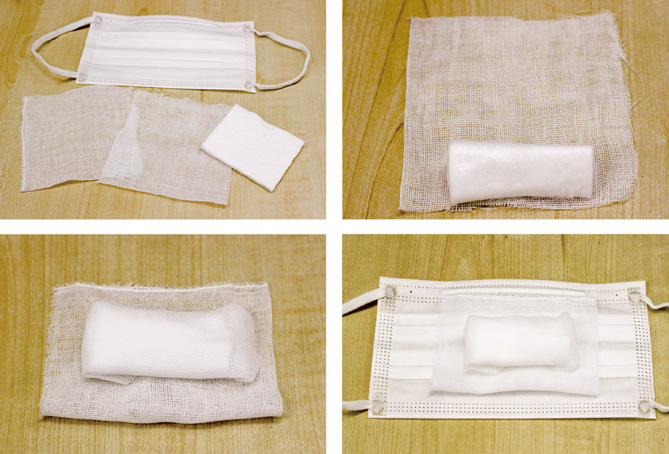 - 市販の不織布のマスクにもう1枚のガーゼを4つ折りにして当てる