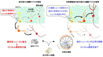 さらに、海馬においてニューロン新生を亢進することが知られている自発的運動を胎仔期 VPA曝露マウスが行うと、けいれん感受性が低下し、異所性ニューロン新生が抑制された。さらに、自発的運動はVPA曝露によってNS/PCsにおいて撹乱されたCxcr4を含む遺伝子群の発現を概ね正常化した。加えて、胎仔期VPA曝露マウスの海馬NS/PCsにおいてCxcr4の発現を補充したところ、新生ニューロンの配置異常やけいれん感受性が改善した。
