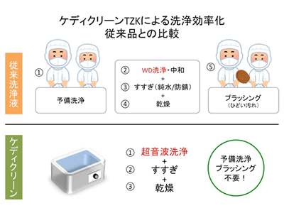 今回開発されたケディクリーンは、超音波洗浄のみで汚れの完全除去が可能で、事前洗浄と汚れのブラッシング除去が必要ない。さらに、鋭利な医療器具にメッシュ容器への投入・取出しなどで直接触れる必要がなく、高い清浄効果が得られる。また、ケディクリーン TZKをベースにしたWD用無泡性洗浄剤であるケディクリーン EXを開発したことで、より幅広く洗浄機への対応が可能となった。