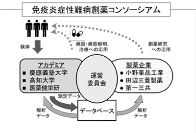 同コンソーシアムは、複数アカデミアと複数製薬企業が参加する新しい形の協業の場。関節リウマチ、潰瘍性大腸炎などの免疫炎症性難病を対象とし、質の高い臨床データを基盤とした詳細な遺伝子発現解析等を行うことにより、免疫炎症性難病に苦しむ患者のための新しい治療法・診断法の開発につなげることを目的として設立された。