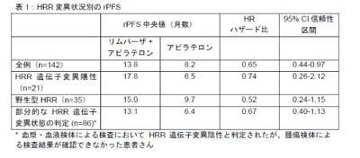 このデータは、相同組み換え修復(HRR)遺伝子変異の有無に関わらず、タキサン系化学療法による前治療歴のあるmCRPC患者を対象とするリムパーザとアビラテロンの併用療法(71例)とアビラテロン単剤療法(71例)を比較した無作為化二重盲検多施設共同第2相試験「Study08」によるもの。rPFS中央値は、リムパーザとアビラテロンの併用療法群では13.8か月に対し、アビラテロン単剤群では8.2か月(HR:ハザード比 0.65;95%CI:95%信頼性区間0.44-0.97;p=0.034)。PFS2中央値に関しては、23.3か月に対し、18.5か月だった(HR 0.79;95%CI0.51–1.21)。OS中央値は、併用療法群の22.7か月に対し、アビラテロン単剤群では20.9か月(HR 0.91;95%CI 0.60–1.38)。事前に計画された探索的なサブグループ解析により、HRR遺伝子変異状況を問わず、患者におけるrPFSの延長が示された。