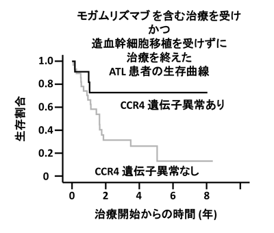 これらの結果から、CCR4遺伝子異常を有するATL患者は、CCR4遺伝子異常を有さないATL患者に比較し、モガムリズマブの治療反応性が極めて良好であること、CCR4遺伝子異常を有するATL患者は、治療効果は高い反面、副作用が強い造血幹細胞移植治療を受けずとも、モガムリズマブ治療によって、長期間にわたり白血病を抑え込める可能性が高いことが明らかとなった。