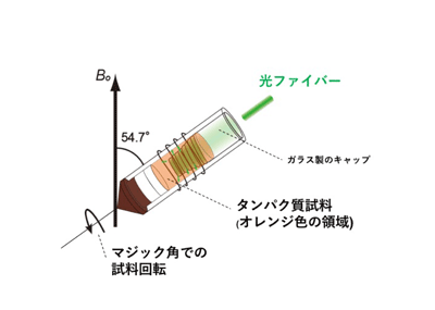 内藤教授と川村准教授は、分子構造を原子レベルで観測できる固体核磁気共鳴分光法を用いて、このようなロドプシンの光中間体を検出するために、光照射固体NMRの開発とその改良を重ねてきた。固体NMRにおいて、高分解能なNMR信号を得るためにマジック角回転法が利用されるが、これに光照射を組み合わせ、試料に対して高い効率で光をあてることを可能にしたのが光照射固体NMR技術だ。