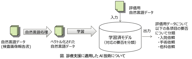 今回開発されたAI技術は、医師の所見などの文章形式のデータ(テキストデータ)に、自然言語処理技術を用いて前処理を施した上で機械学習を適用し、入院や手術、他科への依頼などの対応が必要な症例を分類する。放射線科医が読影した画像検査報告書に対して同技術を活用した結果、高い精度で入院依頼の必要な症例の分類に成功したという。
