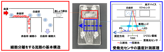 このデバイスは、同社のフォトリソグラフィ技術により樹脂材料に100本以上の微細流路を形成。超微細な流路を樹脂製のプレートに形成することで、細胞など測定したい小さな物質を連続的に分離できる。細胞の計測には、プリンターのトナー濃度検出用の受発光センサーを応用。超小型のLEDとPD(フォトダイオード)を同一のシリコン基板上に形成する京セラ独自の技術を採用し、デバイスの小型化に成功したという。