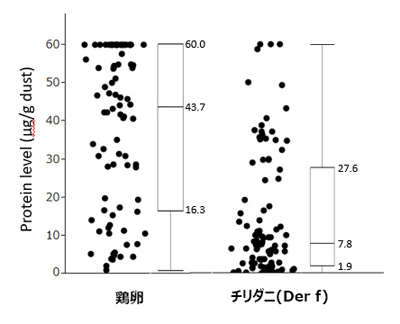 環境省が実施している「子供の健康と環境に関する全国調査(エコチル調査)」のパイロット調査が全国の4施設(自治医科大学、九州大学、産業医科大学、熊本大学)で行われている。今回の研究は、このパイロット調査に参加している子どもの中で、3歳の時点で家庭訪問による調査に協力が得られた約90件の家庭を対象とした。子どもが使用している寝具に掃除機をかけて埃を収集し、埃中の鶏卵アレルゲン量を測定。また、同じ埃から同時測定したチリダニアレルゲン量と比較を行った。測定はELISA法(測定上限は60µg/g)を用い、鶏卵タンパク質はオボアルブミン、オボトランスフェリン、オボムコイドの合算値、チリダニタンパク質はコナヒョウヒダニ、ヤケヒョウヒダニの糞由来のアレルゲンであるDerf1、Derp1の合算値とした。