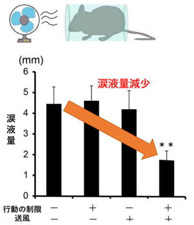 今回研究グループは、マウスの行動を制限し、顔に風を当てるストレス負荷を4時間与えたところ、涙液量が減少することを発見した。次に、遊具を備えた広いケージで複数のマウスを一緒に飼育した「豊かな環境」では、マウスはより多くの感覚、運動、認知的かつ社会的な刺激を受けることができ、このような環境で飼育されたマウスに前述のストレスを負荷したところ、狭いケージで単独飼育した通常環境のマウスとは異なり、涙液量がほとんど減少しないことが確認された。また、通常環境下でストレスを負荷され涙液量が減少したマウスを「豊かな環境」に移し飼育したところ、通常環境に置かれたマウスと比較して涙液量の回復が早いことが判明。これらの結果から、「豊かな環境」に置くことで、涙液量減少を予防でき、涙液量減少の回復も有意に早くなることが確認された。