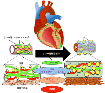 下川教授の研究グループはこれまでに、冠攣縮が生じる分子機序に「Rhoキナーゼ」と呼ばれる分子が関与することを世界に先駆けて明らかにしてきた。冠動脈の外側に炎症が生じると、血管平滑筋のRhoキナーゼの発現や活性が上昇して、血管平滑筋の過収縮(攣縮)の原因となる。血管の外側には、血管を栄養するための微小血管や自律神経などのさまざまな組織が存在しており、その一つに心臓リンパ管がある。心臓リンパは冠動脈のすぐ近くを走行しているリンパ管で、他の臓器のリンパ管と比べて、今までほとんど注目されてこなかった。