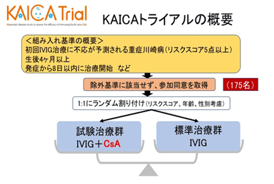 今回の研究に先立ち、同研究グループが行った遺伝的素因の研究から、川崎病が発症、重症化するメカニズムにITPKCとCASP3という遺伝子のバリアント(ヒト集団内でみられる多様性)が関わることが判明していた。以前からネフローゼ症候群などの治療に使われていたCsAには、そのメカニズムを抑える作用がある。CsAは重症化を抑制する切り札となり得ると考え、CsAの使用経験が豊富な小児科医が中心となって、重症川崎病患者にCsAを使った臨床試験を計画した。