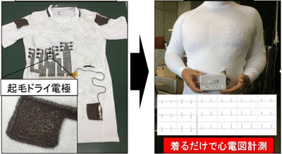 さらに、同電極と同評価装置を用いて電極構造・配置の設計を最適化することにより、従来の心電計測ウェアの皮膚とドライ電極間の接触不安定性の課題を解決し、モーションアーティファクトの影響が軽微な、波形の安定した心電図を計測できるスマートウェアの開発に成功した。同スマートウェアは、皮膚と起毛ドライ電極間の局所的着圧が適切に設計されているため、着るだけでモーションアーティファクトの小さな心電図計測が実現できる。実際に、名古屋大学医学部において実証試験を行った結果、最適化後の起毛ドライ電極ウェアを用いることで、胸部誘導の心電図において、安定した波形の計測を実現することができたという。さらに、増幅回路の追加により、一般的な心電図検査で用いられる12誘導心電図にも容易に拡張可能としている。