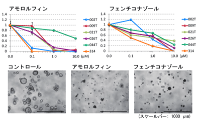 最後に研究グループは、樹立した胆道がんオルガノイドを用いて、東京大学創薬機構から提供された既存薬ライブラリーを用いて薬物スクリーニングを実施。予想通り、ヒット化合物のほとんどがゲムシタビンをはじめとする抗腫瘍薬だったが、これまでに抗腫瘍作用が報告されていないアモロルフィンとフェンチコナゾールもヒットした。そこで、樹立した複数の胆道がんオルガノイドを用いて検証したところ、両剤ともに胆道がんオルガノイドの増殖を抑制することが明らかとなった。特にアモロルフィンはゲムシタビンと同等の増殖抑制効果を示し、正常胆管細胞に対してはほとんど毒性を示さなかったという。
