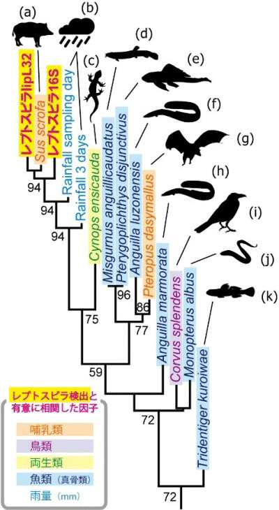その結果、病原性のLeptospira alstoniiや中間型のL. wolffiiなど6種のレプトスピラが検出され、そのDNA配列数が採水時の雨の量と有意に相関することも確認された。さらに、同じ環境DNAサンプルを用いて、レプトスピラと同時に出現する動物のDNAを分析したところ、レプトスピラの保菌動物であることが知られるイノシシやオオコウモリなど10種の動物を特定することにも成功した。また同研究では、同じ手法で細菌類全般を対象としたDNA分析も行っており、河川水中でレプトスピラと同時に出現する12種の環境細菌を検出。その中には、実験下でレプトスピラと共にバイオフィルムを形成することが指摘されているSphingomonas類が含まれた。保菌動物から環境中へ排出されたレプトスピラは、他の共生細菌と共に凝集して環境中に存続し、雨や濁流などによって再び河川水中に拡がるということが推察されるという。