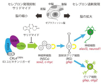 今回、サリドマイドの標的タンパク質であるセレブロンの脳の発生過程における役割が、ゼブラフィッシュのモデル系を用いた研究成果により、初めて明らかにされた。特に、「セレブロンの発現が増加すると脳の神経幹細胞が増加する」という発見は、セレブロンの活性を高めるサリドマイド類似体を同定すれば、脳の神経幹細胞を増やす作用を持つ新たな薬になる可能性を示唆している。