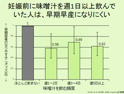 妊娠前にみそ汁を食べる頻度が週1日以下と答えた人と比べて早期早産のなりやすさ(オッズ比)を調べたところ、週1~2日食べる人では0.58(95%信頼区間(CI)0.40-0.85)、週3~4日食べる人では0.69(95%CI 0.49-0.98)、週5日以上食べる人では0.62(95%CI 0.44-0.87)であり、いずれも統計学的に早期早産になりにくいということが判明した。ヨーグルトでは、週1回以下の人と比べて週5回以上食べる人では0.62(95%CI 0.44-0.87)、納豆では、週1回以下の人と比べて週3回以上食べる人では0.60(95% CI 0.43-0.84)であり、ともに統計学的に早期早産になりにくいということが判明。また、早産歴のある女性は納豆を食べた回数の多い方が、早期早産のリスクが下がった(オッズ比0.52(95%信頼区間 0.28-0.97))。一方、妊娠34~36週に分娩となる後期早産のなりやすさについては、いずれの検討においても発酵食品の摂取との間には関連がみられなかったとしている。